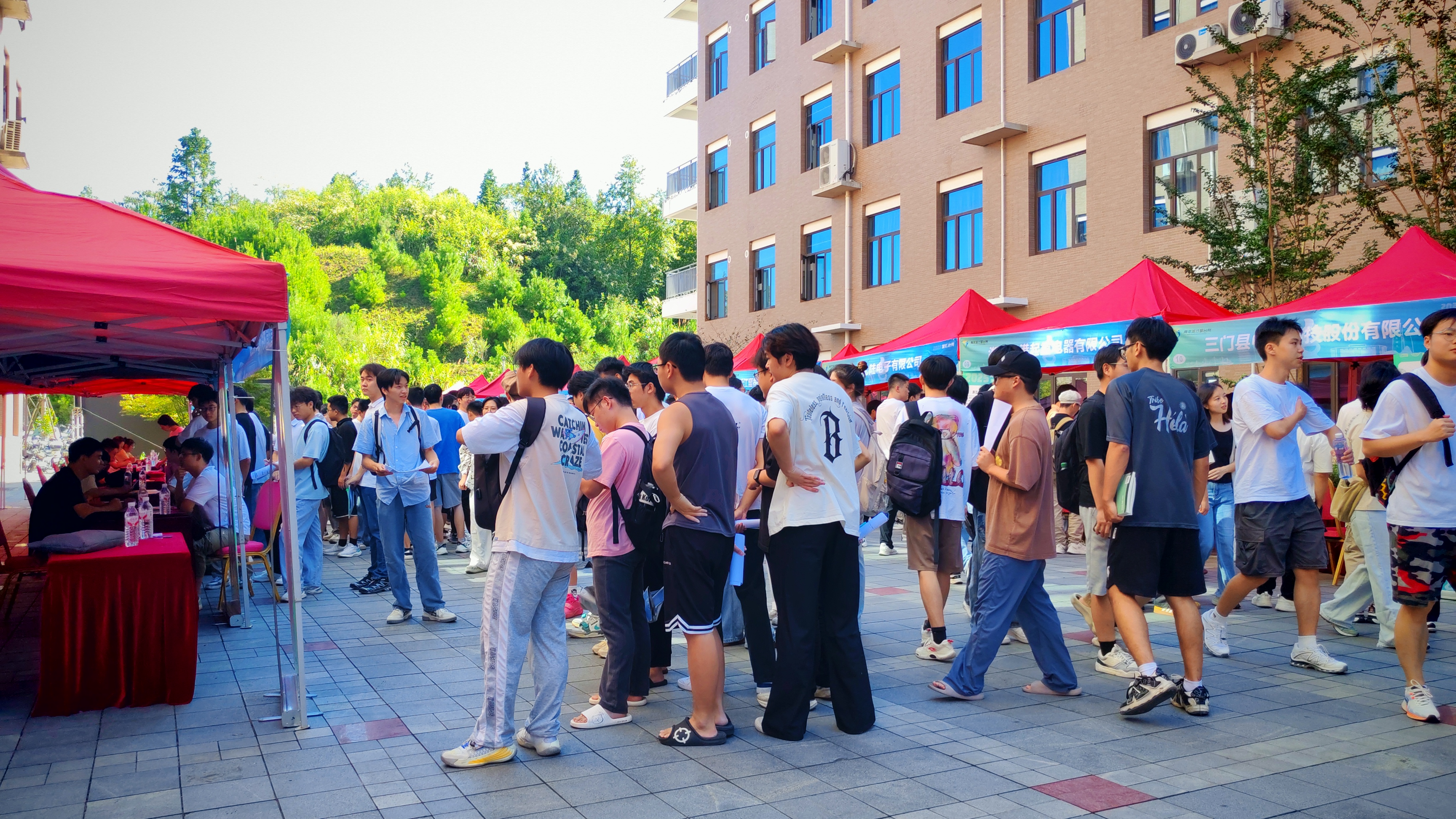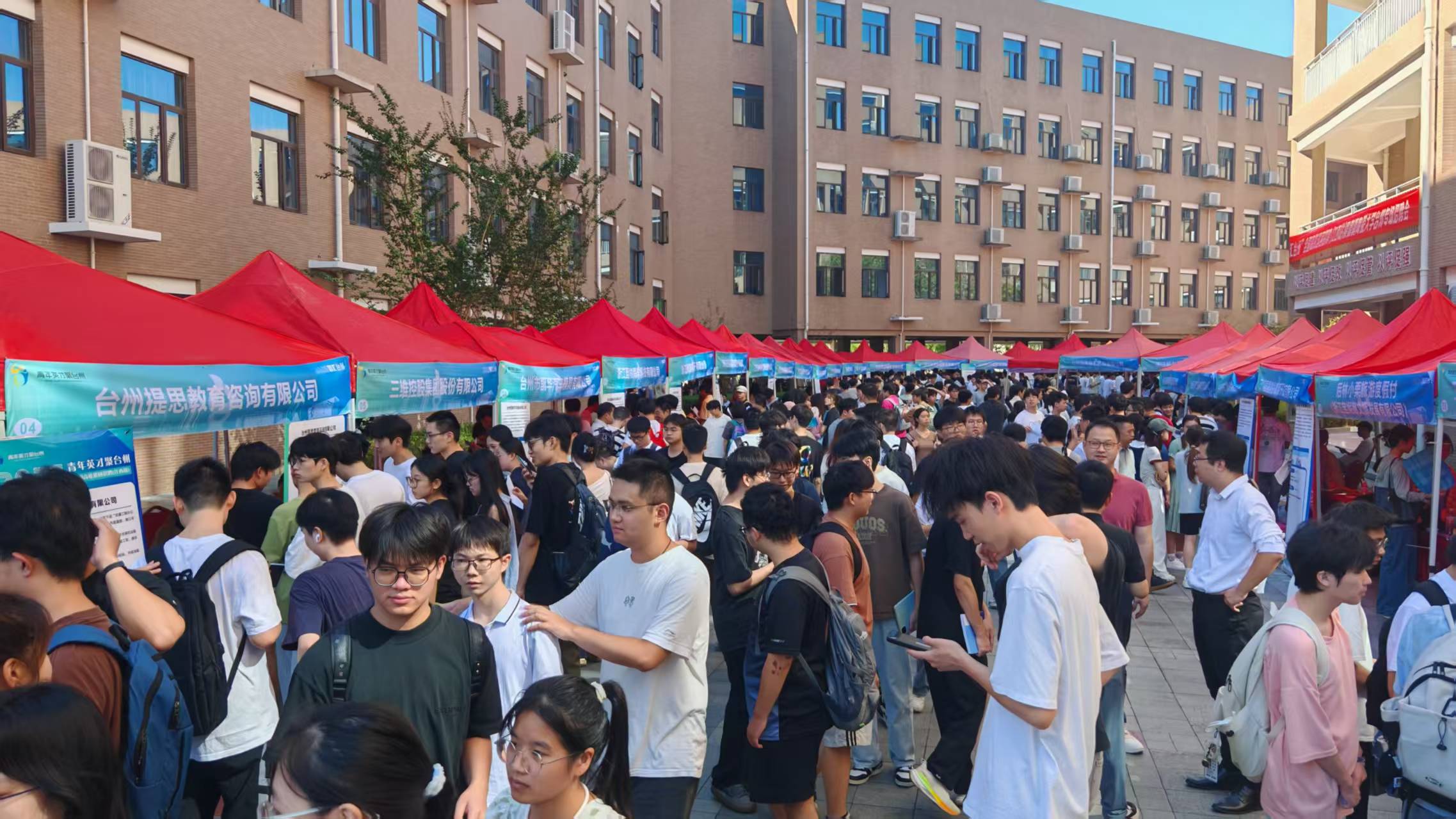 本网讯(易迎欣)为深入贯彻落实党中央、国务院有关毕业生就业工作的决策部署,促进我校2026届毕业生高质量充分就业,为广大用人单位提供优质高效的人才招聘服务,9月19日上午,由景德镇陶瓷大学招生就业处主办,机械电子工程学院承办的2025“智汇台州”全国高校巡回招聘江西周景德镇陶瓷大学专场招聘会在我校湘湖校区的尚学楼广场举办。校党委常委、副校长胡银娇到招聘会现场指导,并与台州市三门县人社局副局长张真关、台州市人才办主任冯国富、用人单位和参会学生交流,了解台州市的企业用人情况和毕业生就业需求,鼓励学生积极投身地方产业发展。