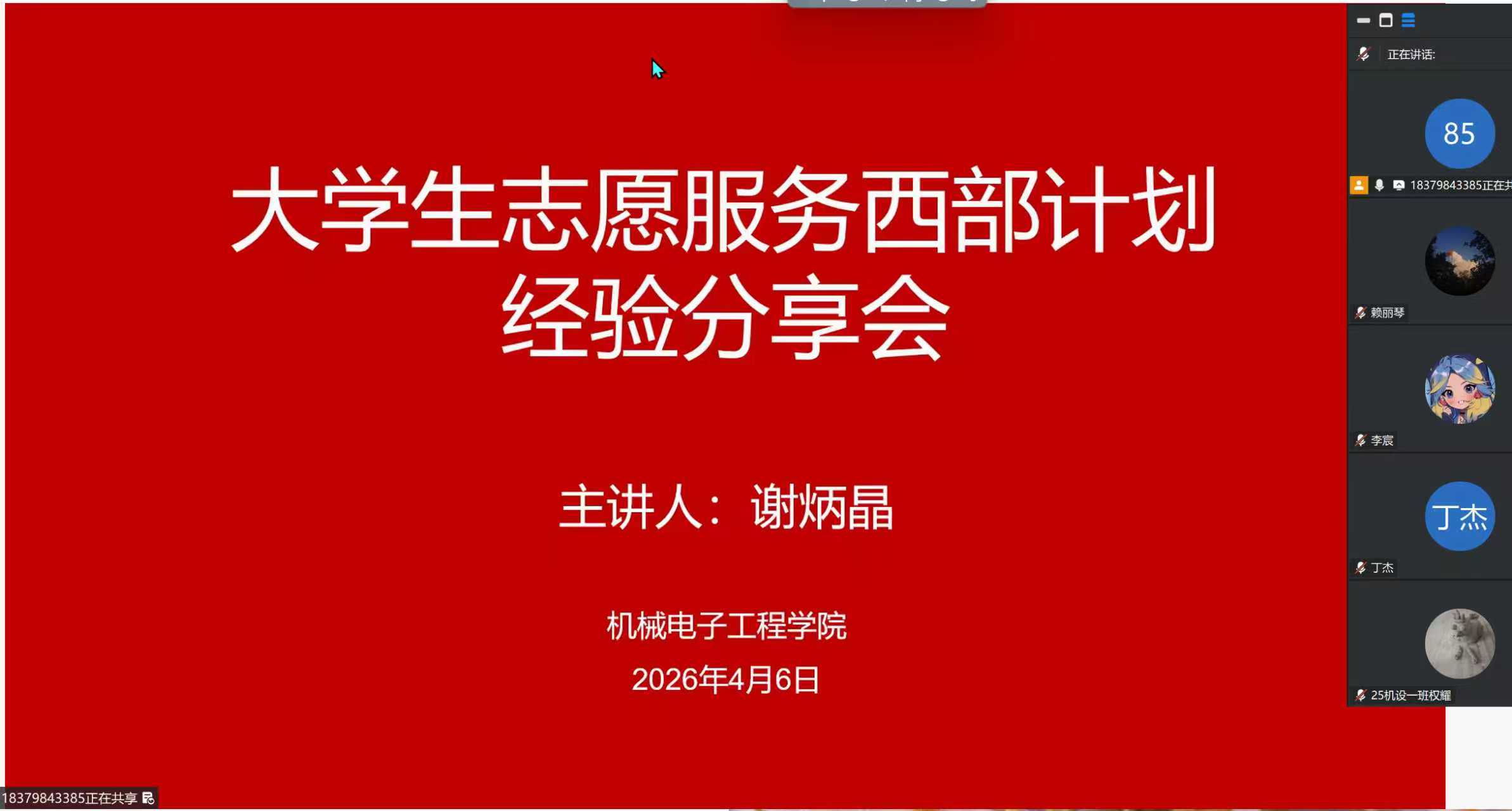 榜样引领,激扬奋斗之志。学院邀请2025届谢炳晶同学线上分享参与西部计划的亲身经历。他用朴实的语言讲述在基层服务期间的工作日常、生活感悟与成长收获,以真实故事回应岗位适应、职业发展等现实关切,激发“见贤思齐”的内生动力,让“青春为中国式现代化挺膺担当”从理念走向实践、从感动走向行动。
