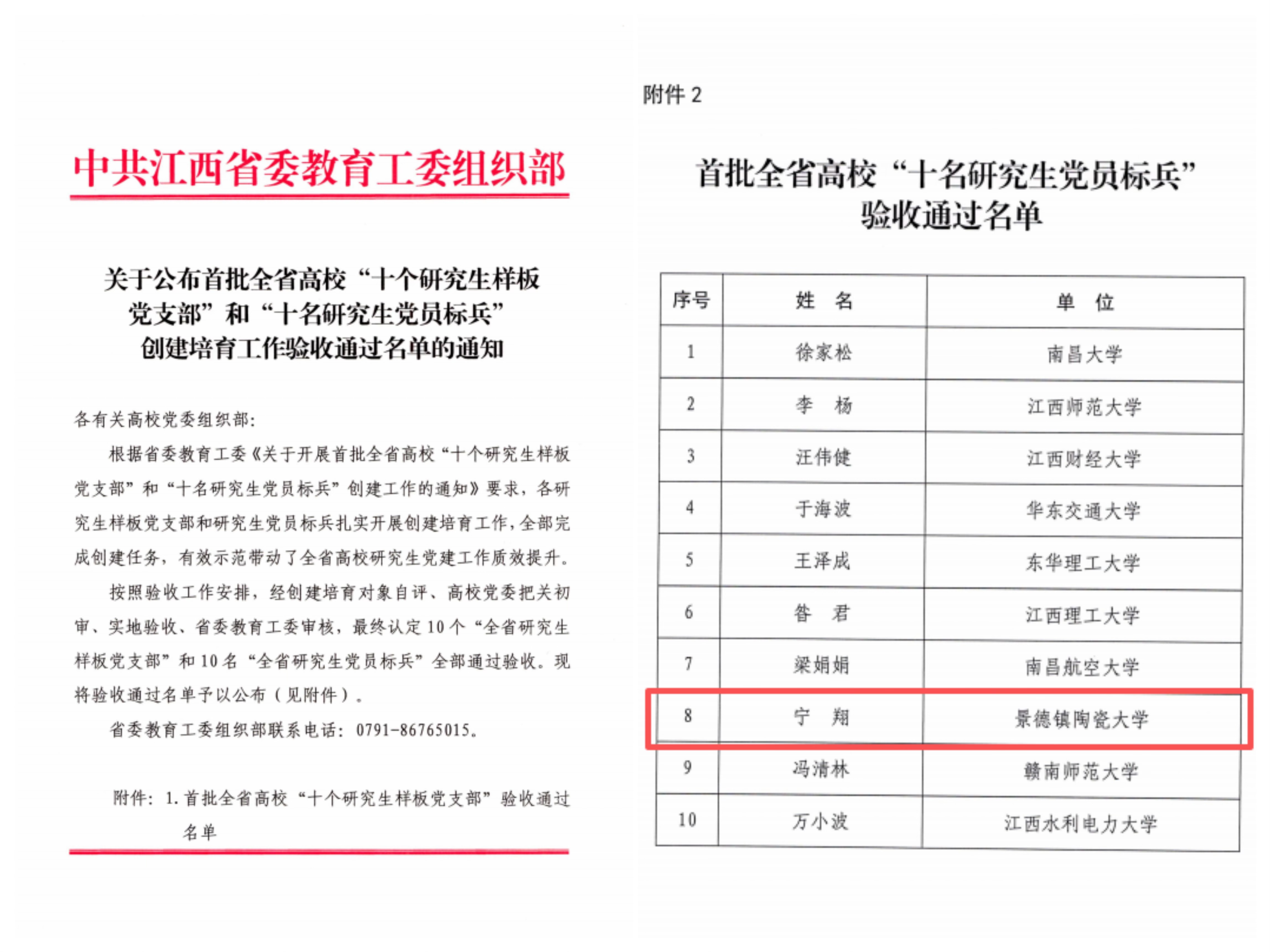 本网讯(李治家)近日,省委教育工委公布首批全省高校“十名研究生党员标兵”创建培育工作验收通过名单,景德镇陶瓷大学机械电子工程学院2025届博士宁翔在列。自2024年5月入选首批全省高校“十名研究生党员标兵”创建培育对象以来,宁翔将科技报国之志融入强国复兴伟业,从理想信念、科研攻关、影响带动三个维度交出了一份亮眼的青春答卷,是机械电子工程学院党委激发党员先锋模范作用凝聚“智造先锋”党建品牌的缩影。